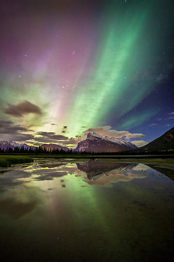 With such a vast canvas to shoot, Paul reveals that his favourite night time subject is the aurora borealis. The advantage of dark skies and high latitude in the Canadian Rockies mean the aurora would come up to ‘play’ from time to time. So while one could predict its likelihood of appearing by looking at data, the aurora is really a ‘right place, right time’ phenomenon to capture.