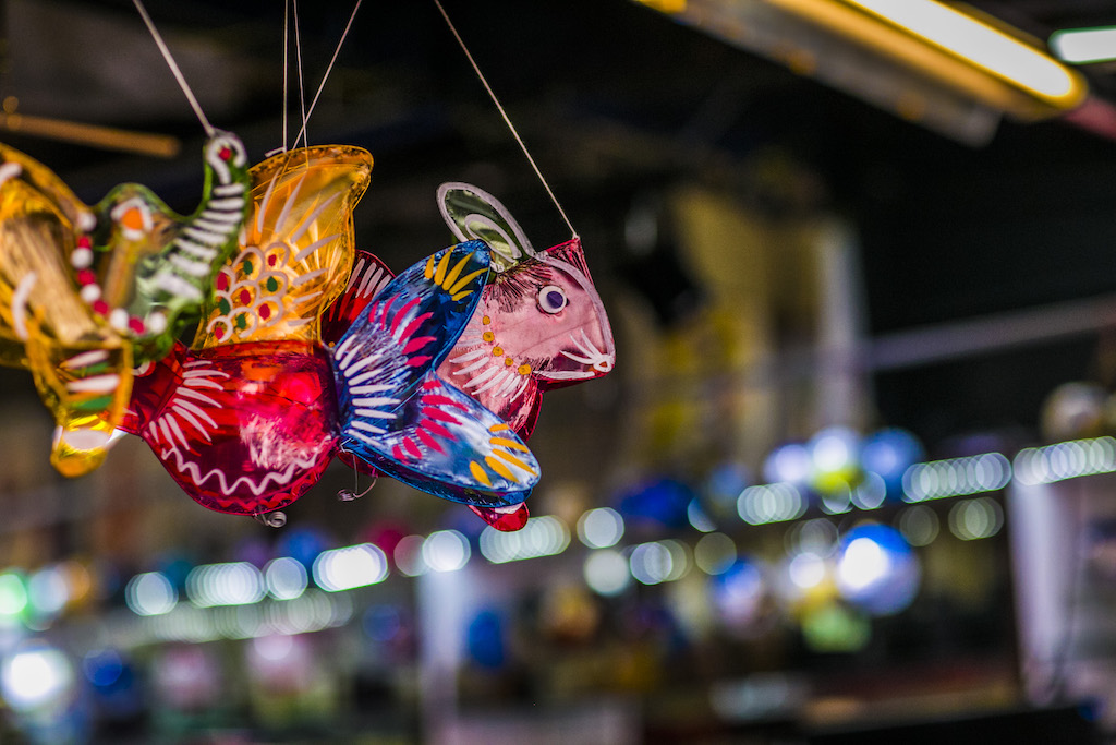 Various lanterns for sale in Chinatown with a beautiful bokeh backdrop.