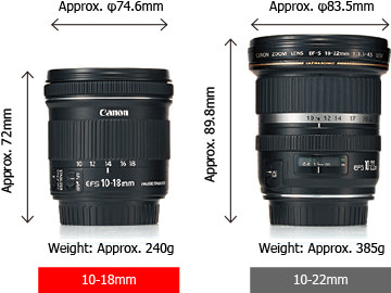 By comparing its size with the EF-S10-22mm f/3.5-4.5 USM (henceforth "10-22mm"), a wide-angle lens with a similar focal length range, you can easily tell how compact the EF-S10-18mm f/4.5-5.6 IS STM is. It is 8.9mm smaller in the maximum diameter and 17.8mm shorter in length than the 10-22mm, and weighs about 145g lighter. Needless to say, this is an attractive item for those who place importance on portability.