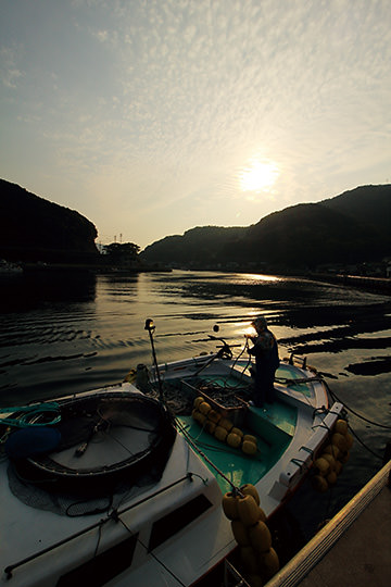 A beautiful scene at a port town in the evening. There were rippling clouds floating in the sky, and sunlight was reflected from the sea surface, with waves formed by the moving boat of a fisherman who had just returned from a hard day's work. I set the focal length to 10mm at the wide-angle end to convey the expanse of the sky and the sea.