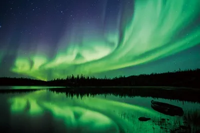 A symmetrical scene of an aurora as seen from the lakeside. I chanced upon this rare opportunity to capture both the calm lake surface and bright aurora within the same shot. I determined the composition, accentuated it with the small, run-down boat near the shore, and waited for the right moment when the bright aurora in front of me started to move.