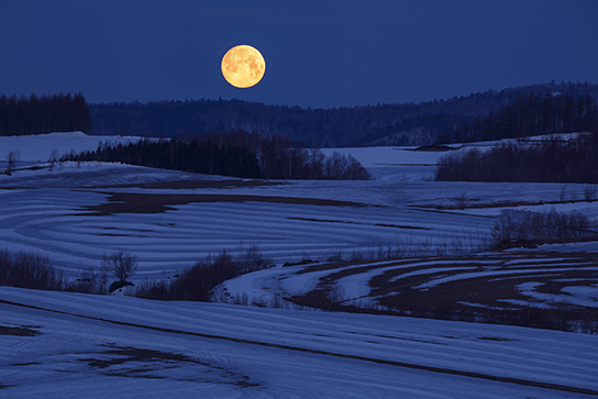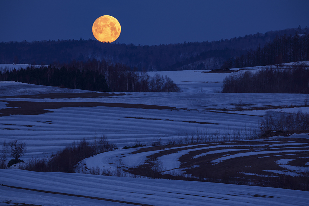 To make the moon look even more impressive, chose a location with a spacious foreground that extends some distance into the back. Frame the image to incorporate more of the foreground: gentle slopes like the ones in this shot are good for this purpose! The large foreground gives viewers the illusion that the scene is deeper and the moon further away. This works together with our larger, super telephoto moon to play with our sense of scale, making us think that the moon is larger than it really appears.