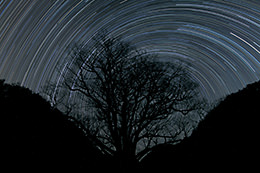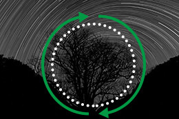 When you shoot the northern starry sky with a long exposure, the starlight turns into rotating star trails. The gradual movements of the stars over time convey a sense of motion. Placing the silhouette of the grove of trees in the centre creates a composition that befits the natural scenery captured.