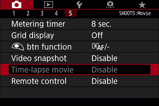 Time-lapse movie is a feature that connects a vast number of still shots into a single movie that depicts changes in the subject or brightness over time. To use this feature, you first need to determine the shooting interval and number of shots to take before starting. The recording time required and playback time are also displayed, which eases planning of the shoot. To shoot time-lapse movies on the EOS 80D, go to [Time-lapse movie] on the SHOOT5 menu and change it from [Disable] to [Enable].
