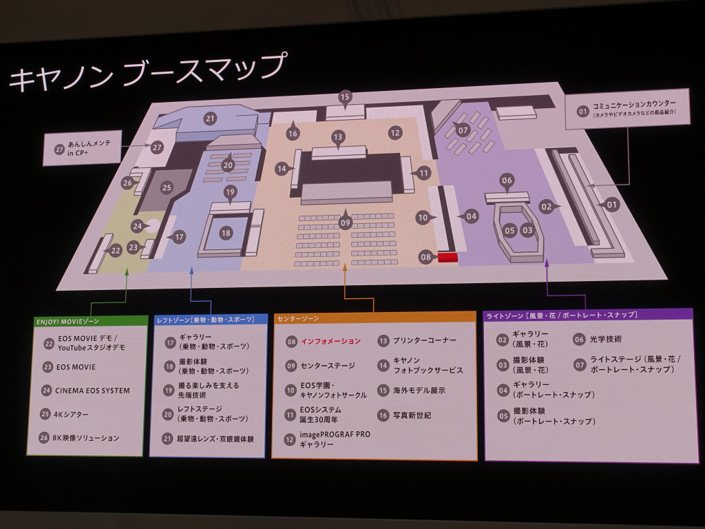 Canon’s booth for CP+2017 experimented with a new way of exhibiting products, dividing its entire range of products and services spanning the entire process of image production from input to output between several corners, each of which revolved around a different photography subject. In doing so, it was hoped that visitors to the show would be able to easily find the products most relevant to the scenes they most wanted to shoot.