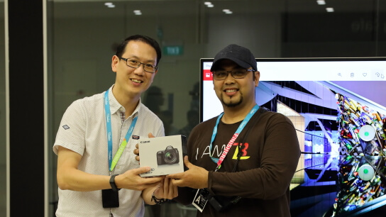 First prize winner Adhitiya Wibhawa (CPMC 2017) being presented with a miniature EOS 5D Mark IV by Hector Niam, Retail and Pro Support Manager at Canon Asia.