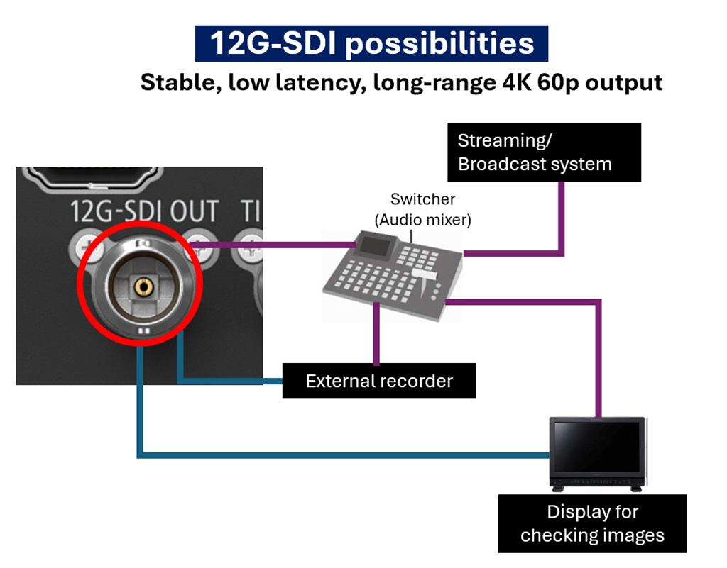 The camera’s 12G-SDI output terminal offers a more reliable way to output broadcast-quality 4K 60p* video for streaming and real-time production: it supports greater transmission distances with just a single cable, allowing simplified yet stable 4K transmission beyond what HDMI can achieve. This also frees up the HDMI and 3G-SDI terminals for other uses such as monitoring or multiview streaming.