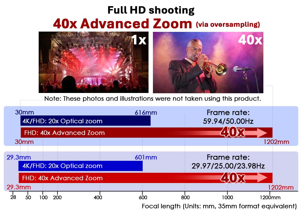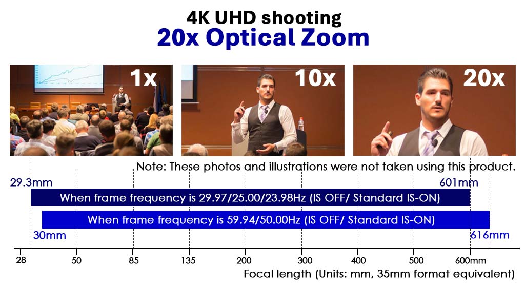 The 20x optical zoom allows you to record 4K video that zooms from 35mm format equivalent focal range of 29.3 or 30mm to 601 or 616mm, depending on whether your frame frequency is 29.97/25.00/23.98Hz, or 59.94/50.00Hz*. That’s enough to go from a wide-angle overview to close-up shot from the back of a lecture theatre!