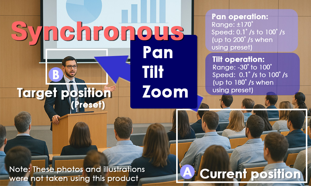 You can set the camera so that it reaches a preset target position regardless of your current position and angle of view. With support for synchronous PTZ, the camera pans, tilts, and zooms simultaneously to reach the target, allowing a quick return to the main shot or key person of interest.