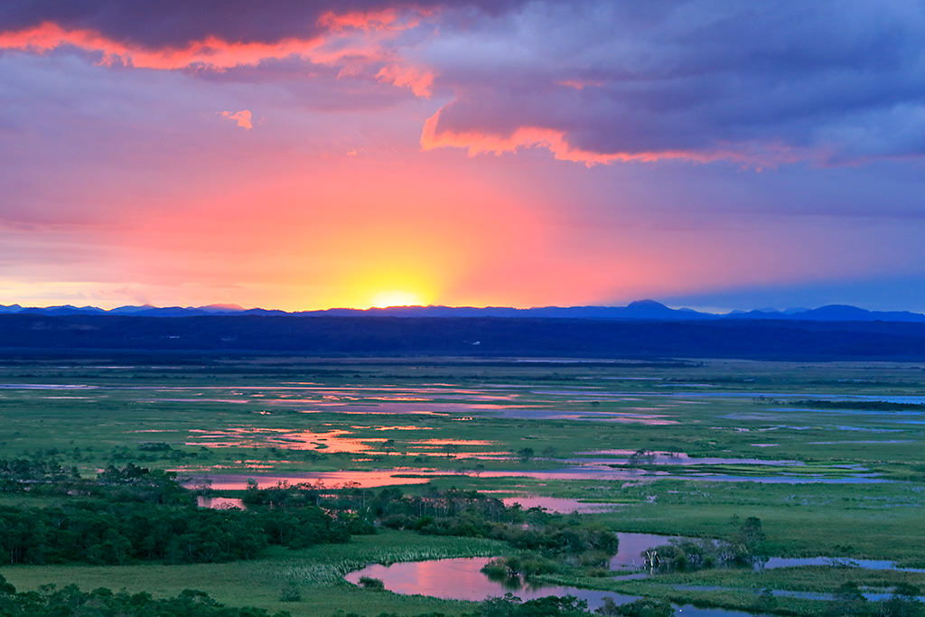 It is very tempting to feature the sky in your composition, especially at dawn or dusk where there are many transitions. This is what happened in the above photo, where I shot at eye level to include both the sky and the marsh in the frame. However, leaving most of the sky out of your composition, keeping the marsh as the point of focus and composing your photo to provide a birds’s-eye view of it helps to bring more depth to this scene of a marshland steeped in the rich colours of dusk.