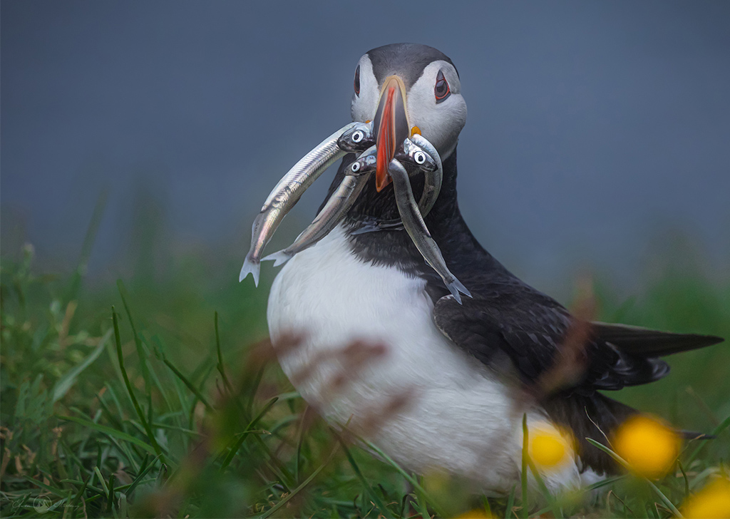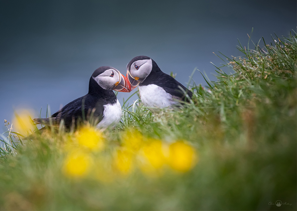 Photographing birds is not just documenting them, you have to apply visual design and frame dynamics. It will be hard and sometimes cropping is a must because you are after the moment. One tip is to give space in your frame when photographing them – try not to have a tight shot, this will give you the flexibility to creatively crop later in post-production. Photographing static puffins will be easy, with their colourful beaks and wide eyes, and you can use colours as a natural frame and as an anchor point. I usually find an angle to include the grass and flowers to accentuate the already beautiful puffins.