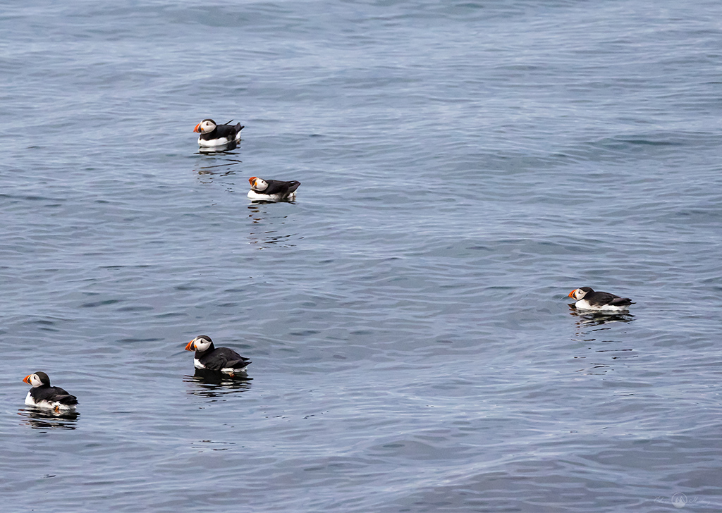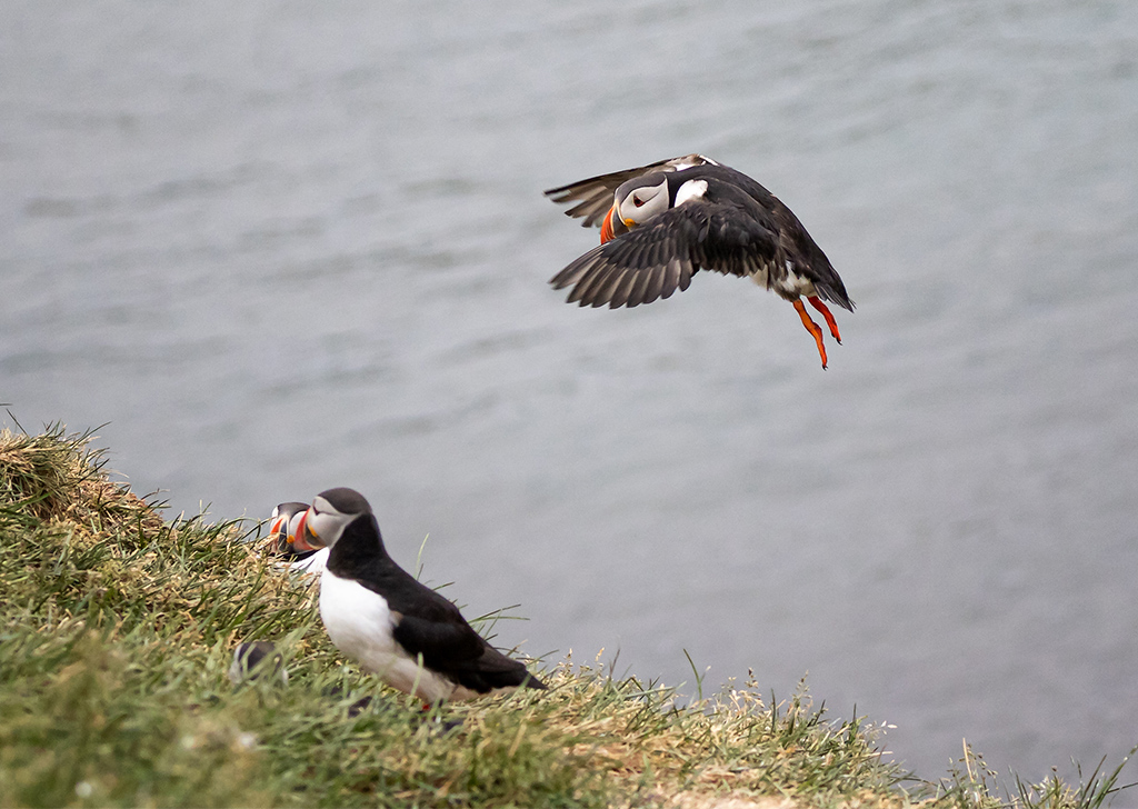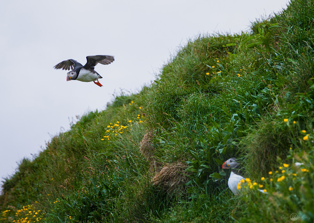 For the most part of the year, Atlantic puffins live in the open ocean, they only fly and stay on the land during mating and nesting. Also, did you know that puffins are excellent fliers? Flapping their wings at up to 400 beats per minute, puffins can reach speeds of 88 km/h (55mph). Photographing them in flight is a challenge and you need to anticipate their direction. Another cool thing about puffins is that they are monogamous, they return to the same burrow during nesting and usually end up with the same mate.