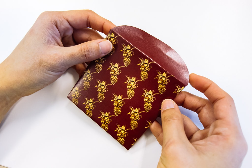Create a monogram using a pineapple ornament, line up pineapple tarts to form the word ‘prosperity’ in Chinese, or use kuih rose as decorating borders, these Chinese New Year items can be reused and made into quirky designs on your ang pows. First, snap a photo of your subject (as seen above) and then, by using Photoshop, create a motif, and overlay that on a colour of your choice. Print out the design and follow these simple steps to create your very own ang pows.