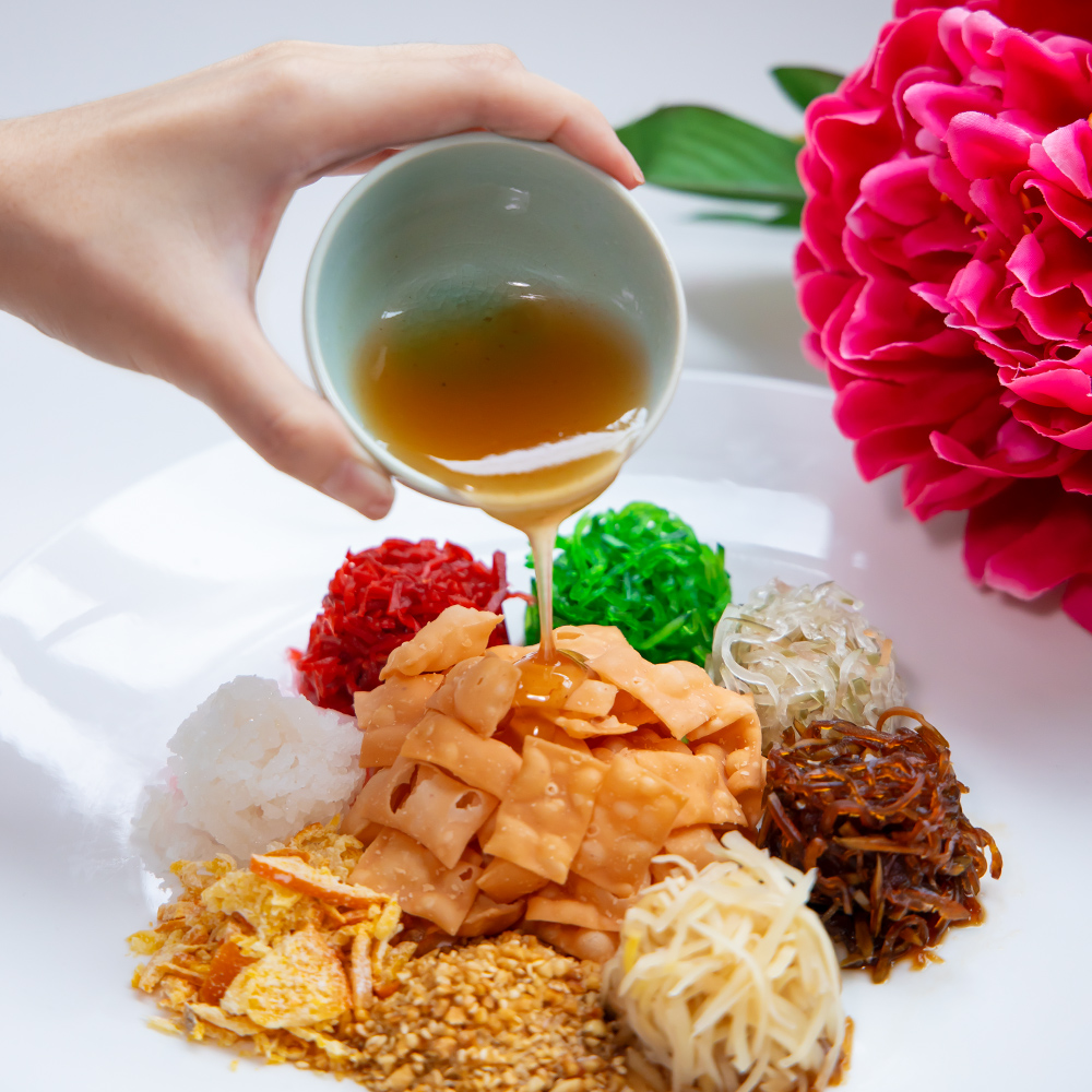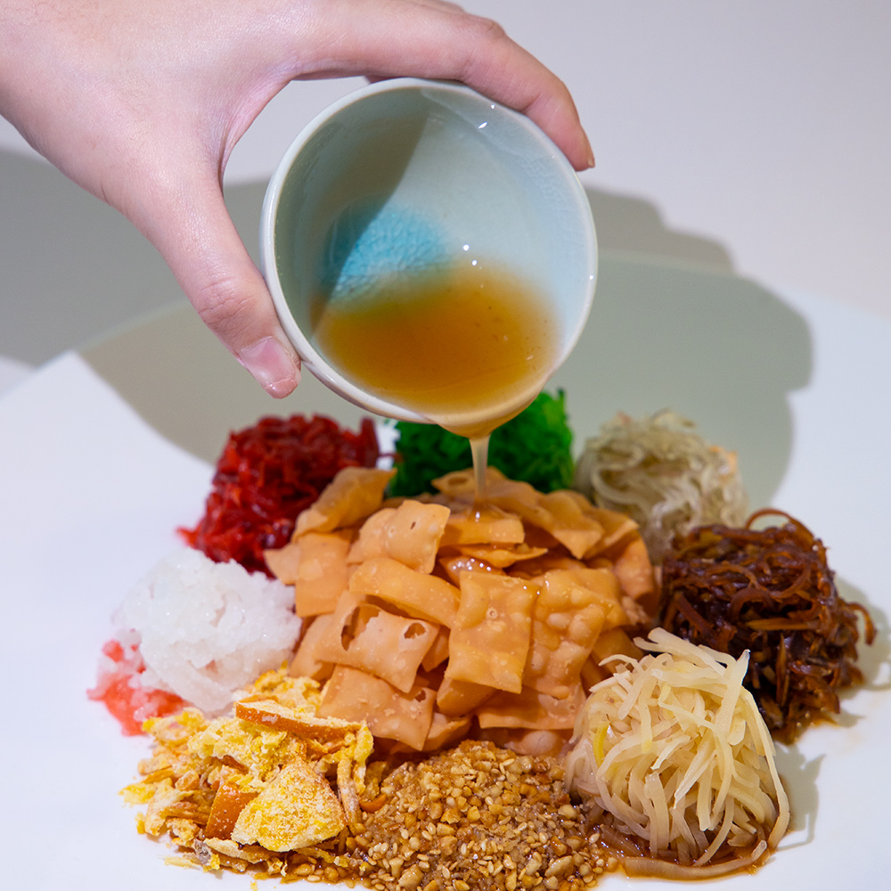Tip: Add motion or a human element to help craft a better narrative of your dish. To capture the moment plum sauce is poured onto the yu sheng, we used the EOS R’s high-speed continuous shooting mode and set a shutter speed of 1/400 seconds.