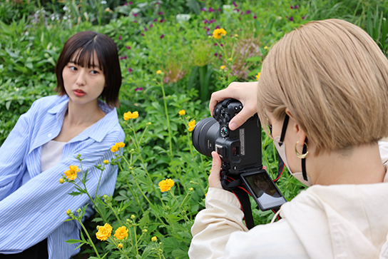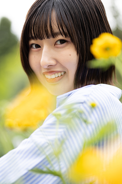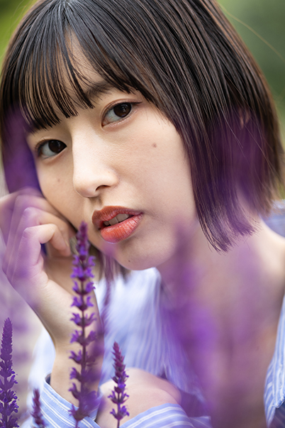 A wider aperture will create more intense blurring. Place the lens as close as possible to the object you are blurring out (flowers in my case) so that it goes firmly out of focus. Here, I used the RF85mm f/2 Macro IS STM, which is easy to handle and provides a comfortable working distance for half-body portraits and chest-up shots.