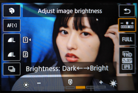 The ‘Portrait’ SCN mode chooses the widest aperture setting possible to create background blur so that the subject stands out. It also makes hair and skin appear soft and smooth. Tapping the button indicated by the red frame lets you control the brightness so you can make the skin look even better.