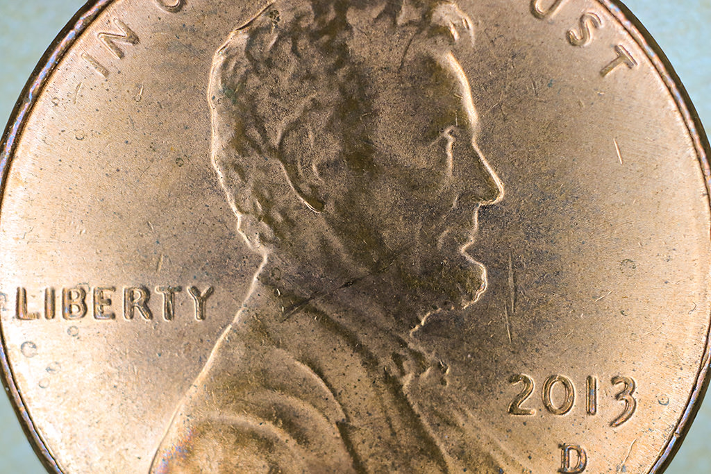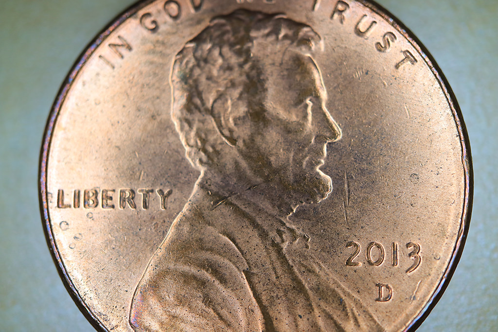 [1.0x] A 1 cent coin captured using 1x magnification. One of the benefits of an APS-C camera is that you can obtain a 1.6x crop factor at 35mm film-equivalent.