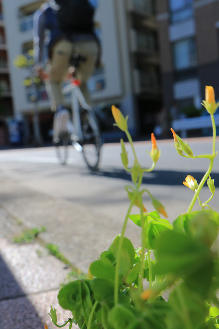 The contrast between a bicycle and grass on the side of the road. This is also an image that is possible because this macro lens also has quite a wide angle. I set a narrow f-number of f/11 to include the background. In street macro photography, the appropriate selection of the f-number is critical.