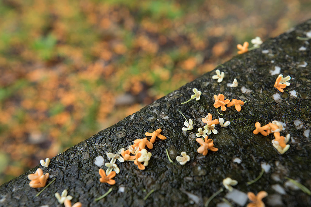 This picture of fallen osmanthus flowers on a stone bench was shot at focal length 35mm, shooting distance 28cm. The osmanthus flowers in the background are still distinct even at f/5.6, and the wetness of the stone bench is depicted in true-to-life detail.