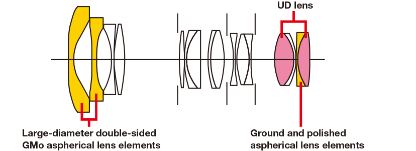 2 large-diameter double-sided glass-moulded (GMo) aspherical lens elements at the front and 1 ground and polished aspherical lens element at the back of the lens construction prevent distortion, field curvature and astigmatism. Transverse chromatic aberration, which tends to occur with wide-angle lenses, is suppressed with the use of 2 ultra-low dispersion (UD) lens elements.