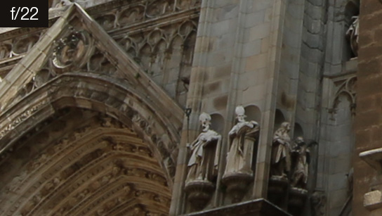 Narrowing the aperture of a lens restricts light in the surrounding area of the lens from entering, thereby reducing the different types of aberrations. However, narrowing the aperture excessively may result in diffraction instead. Take the photo captured at f/22 as an example. The depictive performance of the camera and the lens is compromised as a result of diffraction. Thus, when you are narrowing the aperture to increase the depth of field, it is important that you identify the f-number at which the resolving power is at the peak, review the composition and point to focus on accordingly, to ensure that you do not narrow the aperture unnecessarily.