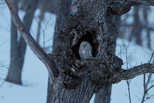 I tried shooting an Ural owl after sunset using Live View. Even in the dark, the focus was established perfectly when I touched the LCD screen. I never thought that Face + Tracking Priority AF would be this superb! I set a slow shutter of 1 second because it was very dark, turned off the image stabilizer, and used the remote switch to quietly release the shutter. Because mirror shock is kept to a minimum, I was able to take beautiful photos.