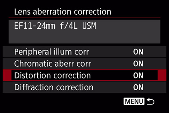 This is the menu for correcting any influences caused by the optical characteristics of the lens. Peripheral illumination correction, chromatic aberration correction and diffraction correction are set to [Enable] by default while distortion correction is set to [Disable].