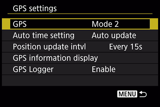 The GPS logging function consists of two modes. In Mode 1, GPS signals are received at periodic intervals even when the power of the camera is turned off, and information is stored once the power of the camera is turned on. In Mode 2, the GPS logging function turns off too when the camera is powered off. When the GPS Logger feature is enabled, positional information is acquired at regular intervals, enabling you to display the route covered by the camera on a map using the Map Utility software.