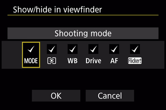 You can alter the settings for shooting mode, metering mode, white balance, drive mode, AF operation and flicker detection through the viewfinder display.