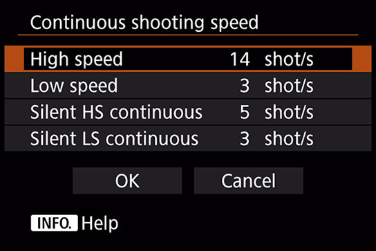 The continuous shooting speed can be set freely to any frame rate between 2 to 14 fps during viewfinder shooting, and to 16 fps or between 2 to 14 fps during Live View shooting.