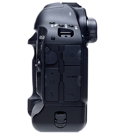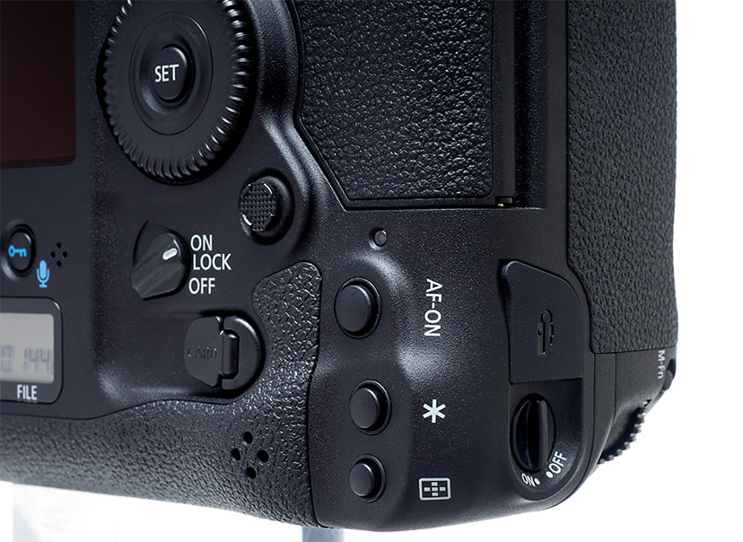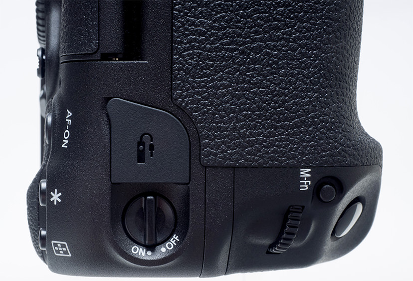 The control dials and buttons on the same side as the vertical grip. The shape of the grip where the fingers rest on has been modified, and the M-Fn button is now located in front of the Main Dial. Also, the Vertical-grip On/Off switch has been moved downward with the Remote control terminal (supporting N3-type remote controls) above it.