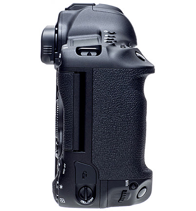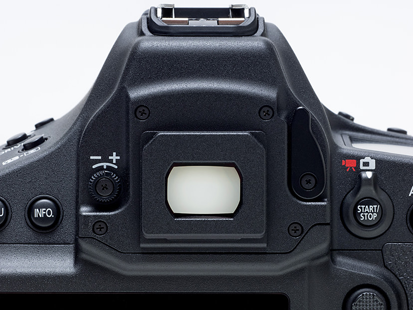 The dioptric adjustment knob and eyepiece shutter lever come into view when you remove the eyecup. Among Canon cameras, the EOS-1D models are the only class that comes with an eyepiece shutter for shutting out external light coming from the viewfinder.