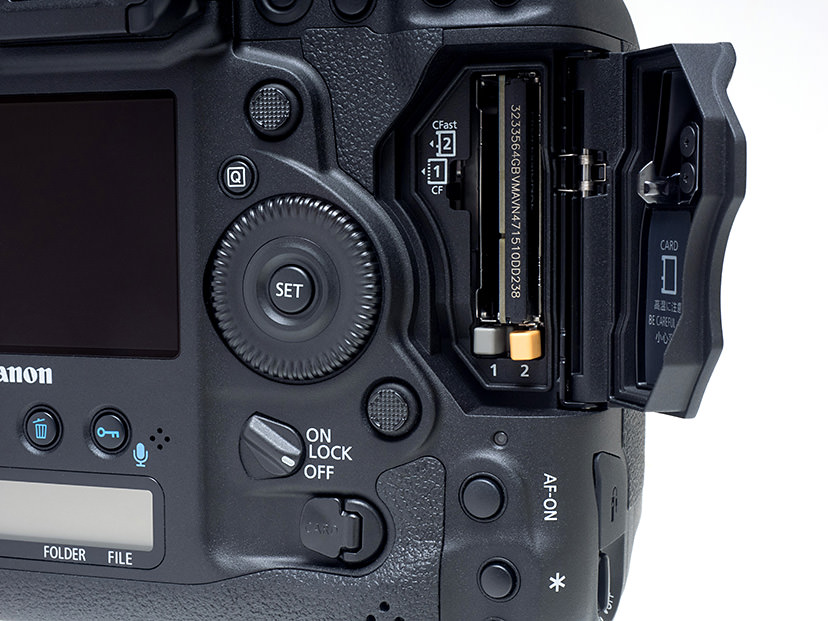 The EOS-1D X Mark II comes with two card slots, one of which is a CF slot that is compliant with UDMA Mode 7, while the other is a CFast 2.0 slot that supports high-speed writing. Each of the card slots can be configured to [Standard], [Auto switch card], [Rec. separately] or [Rec. to multiple] when writing images. The CFast 2.0 slot is not compatible with CF cards and vice versa, so only one CF card and one CFast 2.0 card can be inserted at a time .