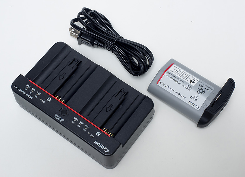 The Battery Charger LC-E19 supports simultaneous charging of two batteries. The lamp indicates the charging status as well as the estimated usable time. In addition, the charger also offers a calibration feature for discharging residual charge, as well as a feature that checks for deterioration in the battery. It can also be used for charging LP-E4N/LP-E4 batteries.