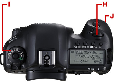 Besides making changes to the design at the top of the grip (H), the way the letters are imprinted on the Mode Dial (I) has also been altered. The design around the shutter button has also been revised for a more sophisticated feel (J).