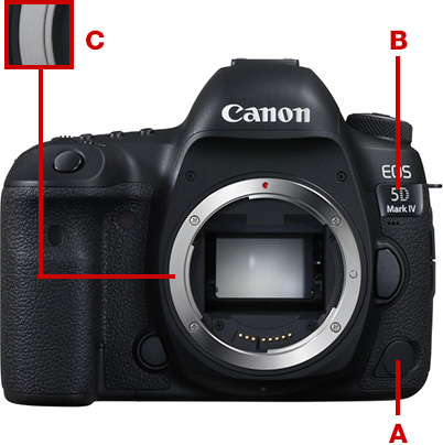 The terminal for cable release (A) is now moved to the front of the EOS 5D Mark IV, which is why the team changed the logo plate design (B). Also, though not immediately visible, a built-in dust- and water-resistant ring was added to the circumference of the lens mount (C).