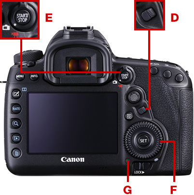 While no changes have been made to the position of the main buttons, a new AF area selection button (D) has been added. Other minor changes include the position of the index for the Live View shooting/Movie shooting switch (E), the design of the Quick Control Dial (F) and the position of the light sensor (G).