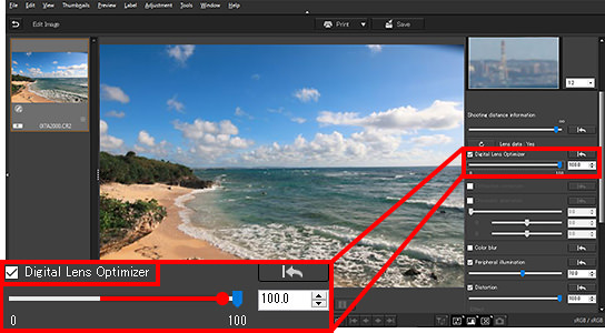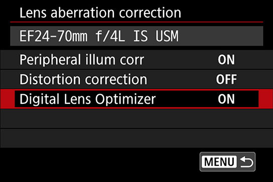 Just like its in-camera counterpart, enabling the DPP 4 version of Digital Lens Optimizer will automatically disable the diffraction correction and chromatic aberration correction functions of Lens Aberration Correction, so as to avoid conflict between the features.