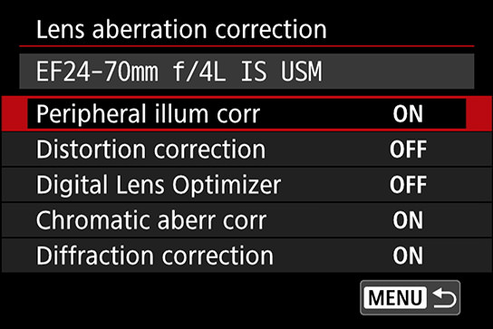 The EOS 5D Mark II featured only “Peripheral illum corr.”. On the EOS 5D Mark III, chromatic aberration correction was added to this, and both were categorized as lens aberration correction functions. More of such functions were added on the EOS 5D Mark IV, such as distortion correction, which until then could not be fixed in-camera. These additions helped improve the usability of the lens aberration correction function.