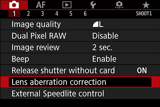 1. On the [SHOOT1] menu tab, select [Lens aberration correction] and then press the SET button.