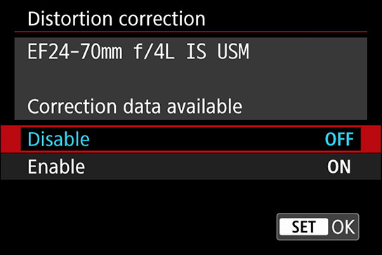 2. Check to see if the correction data for the attached lens is available. Then go to the function you wish to apply and select [Enable] to turn it on.