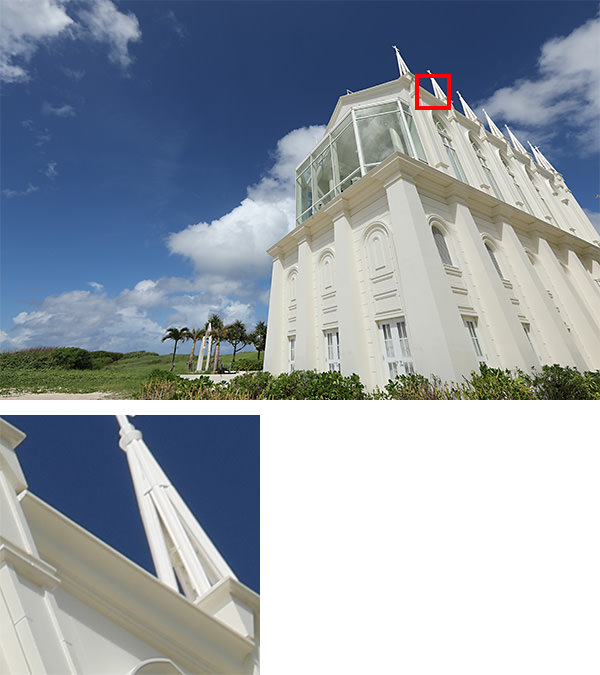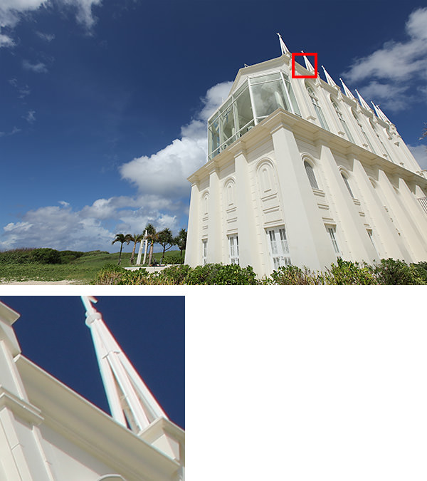 It may not be as obvious as the barrel distortion in wide angle shots, but images shot at telephoto angles will have pincushion distortion, visible in the above example. Correcting this depicts the building shape more accurately—observe how the lines in the roof are straighter. This is easier to shoot when you display the grid in the viewfinder/LCD screen.