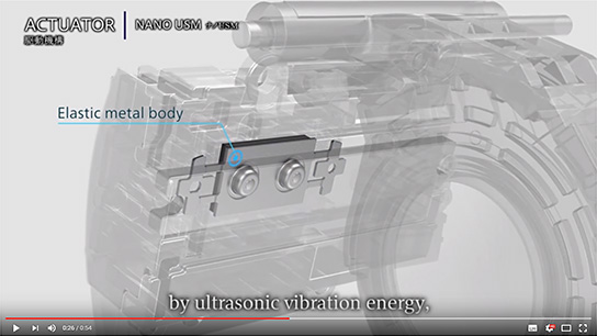 Unlike in other USMs, the piezoelectric ceramic element of a Nano USM does not generate rotational movement from ultrasonic vibrations. Rather, these vibrations are converted into linear motion, which is used to directly drive the optical element coupled to the slider. By making use of this characteristic, a 4.3x improvement in the maximum AF speed at the telephoto end was realized compared to the EF-S18-135mm f/3.5-5.6 IS STM. This also allows for smooth focusing and a silent drive, both of which are indispensable requirements in videography.