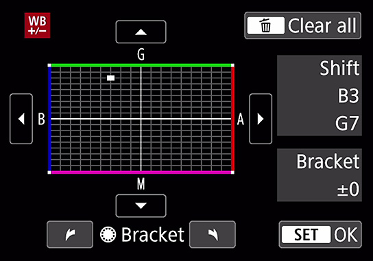 Select [WB Shift/BKT.] from Shooting Menu 2 to display the WB correction screen. With WB correction, the white balance can be adjusted to one of nine levels with the B-A axis and G-M axis. Combining these 2 axes gives you a total of 360 possible colour variations from the starting WB. Here, I adjusted the WB to “B3” and “G7”.
