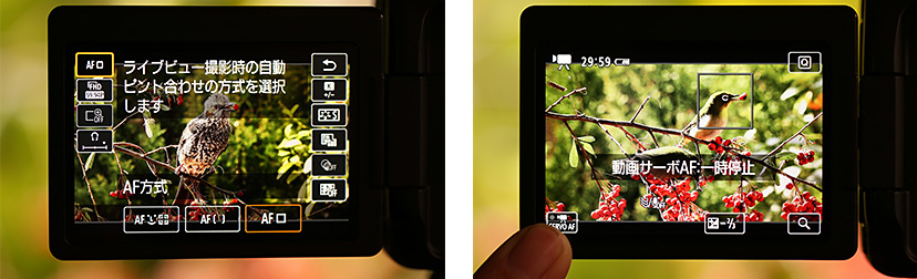 The AF area selection mode screen (left); Movie Servo AF paused (right)
