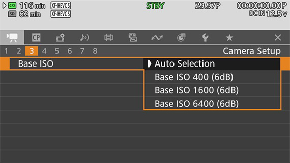 The base ISO settings are: - ISO 800, 3200, and 12800 (Canon Log 2/ Log 3/ RAW) - ISO 400, 1600, and 6400 (Canon 709/ BT.709/ Wide DR/ PQ/ HLG)