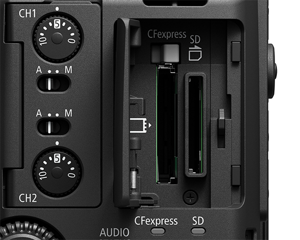 RAW files are recorded internally to the camera’s CFexpress Type B card slot in the efficient 12-bit Cinema RAW Light format, which achieves smaller file sizes about a third to a fifth of a standard Cinema RAW file. You can choose from three recording options (Light, Standard, and High Quality) depending on your file size and workflow requirements.