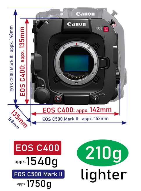 Because of the shorter back focus distance of the RF mount, the EOS C400 is just around 1540g (body only) with dimensions of approximately 142mm x 135mm x 135mm (W x D x H), around 10% smaller and 210g lighter than the EOS C500 Mark II. In a barebones setup, its compact body fits comfortably on a gimbal or even a drone.