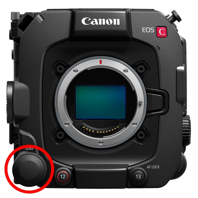 A dedicated 12-pin LENS terminal on the front of the camera (circled in red) enables direct power delivery to broadcast and CINE-SERVO zoom lenses.