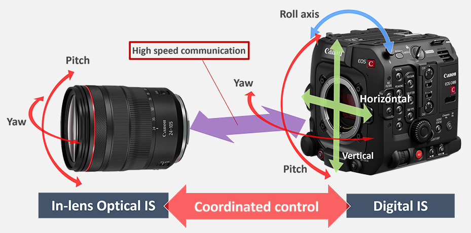 When used with a lens with built-in Optical IS, the EOS C400’s digital image stabilisation system (Digital IS) coordinates with the in-lens IS to perform enhanced 5-axis image stabilisation. This is possible because the RF mount enables high-speed communication between the lens and the camera.